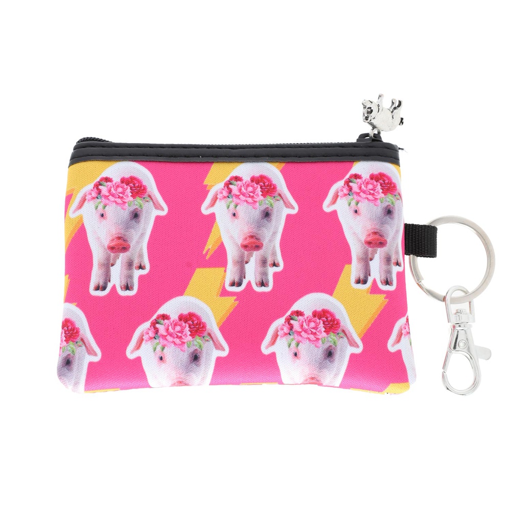 WESTERN PIG AND THUNDERBOLT PATTERN KEYCHAIN COIN BAG WITH ZIPPER CHARM CLOSURE
