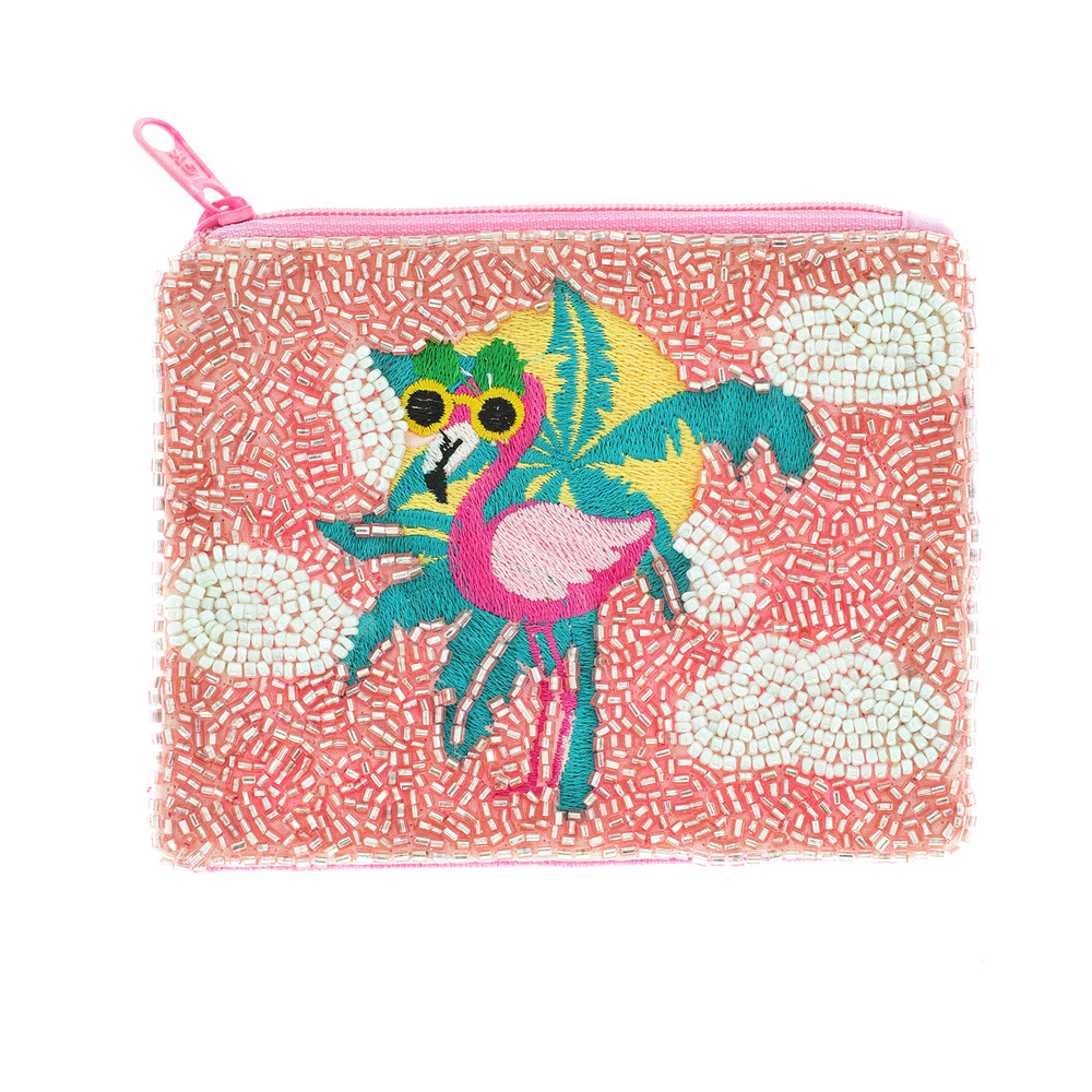 SEED BEAD TROPICAL FLAMINGO HANDMADE BEADWORK ZIPPER COIN BAG