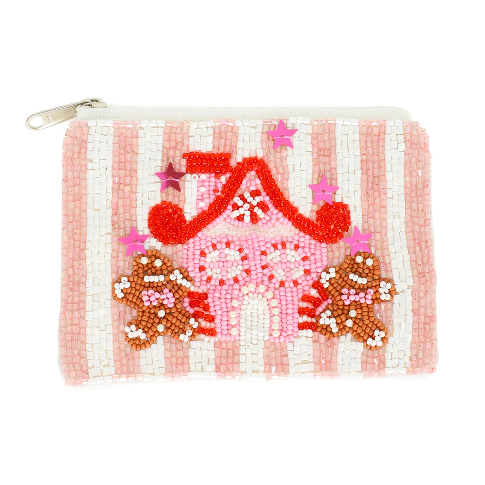 CHRISTMAS BEAD EMBELLISHED GINGERBREAD MAN AND HOUSE COIN BAG