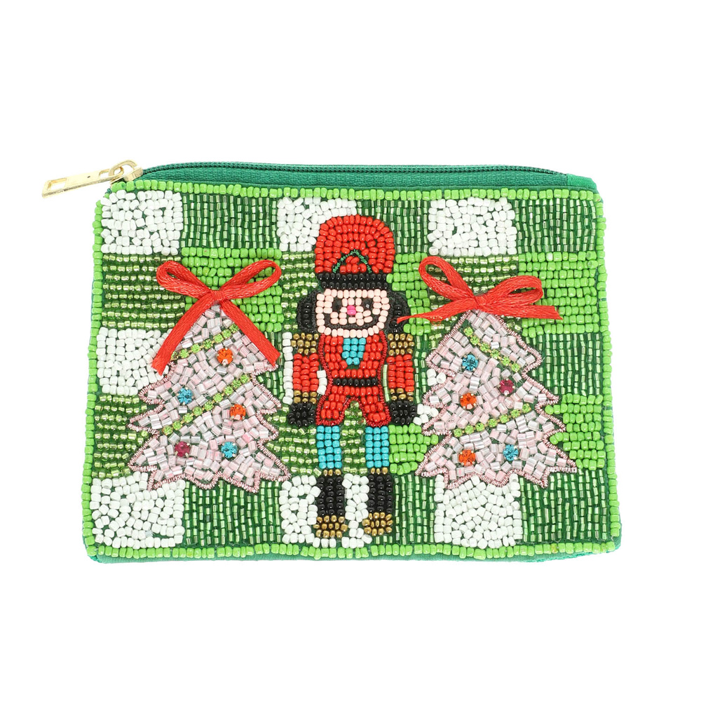 CHRISTMAS NUTCRACKER & TREE SEED BEADED COIN BAG WITH CRYSTAL ACCENTS