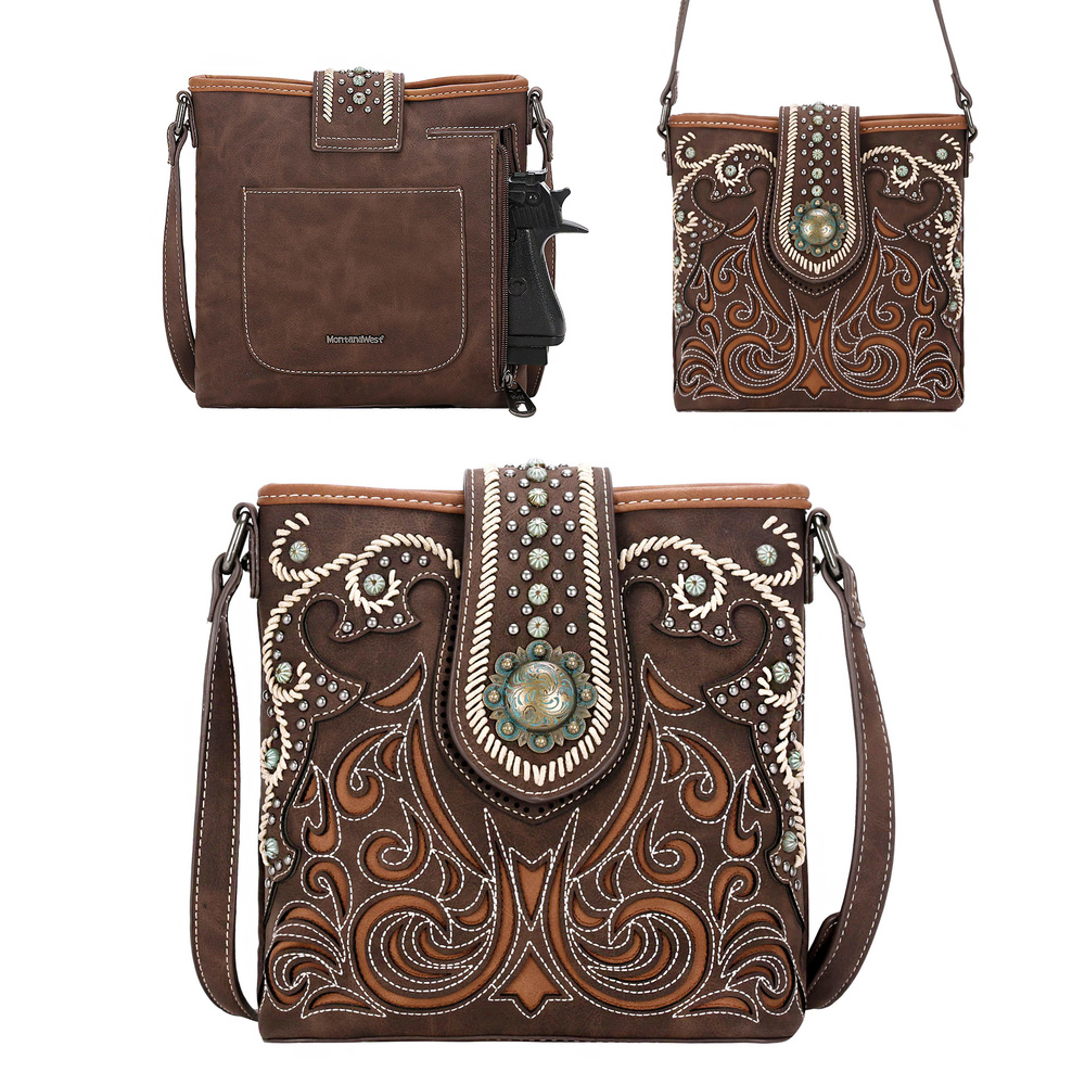 VINTAGE WESTERN CONCHO BUCKLE EMBROIDERED CONCEALED CARRY CROSSBODY BAG WITH MAGNETIC BUTTON CLOSURE