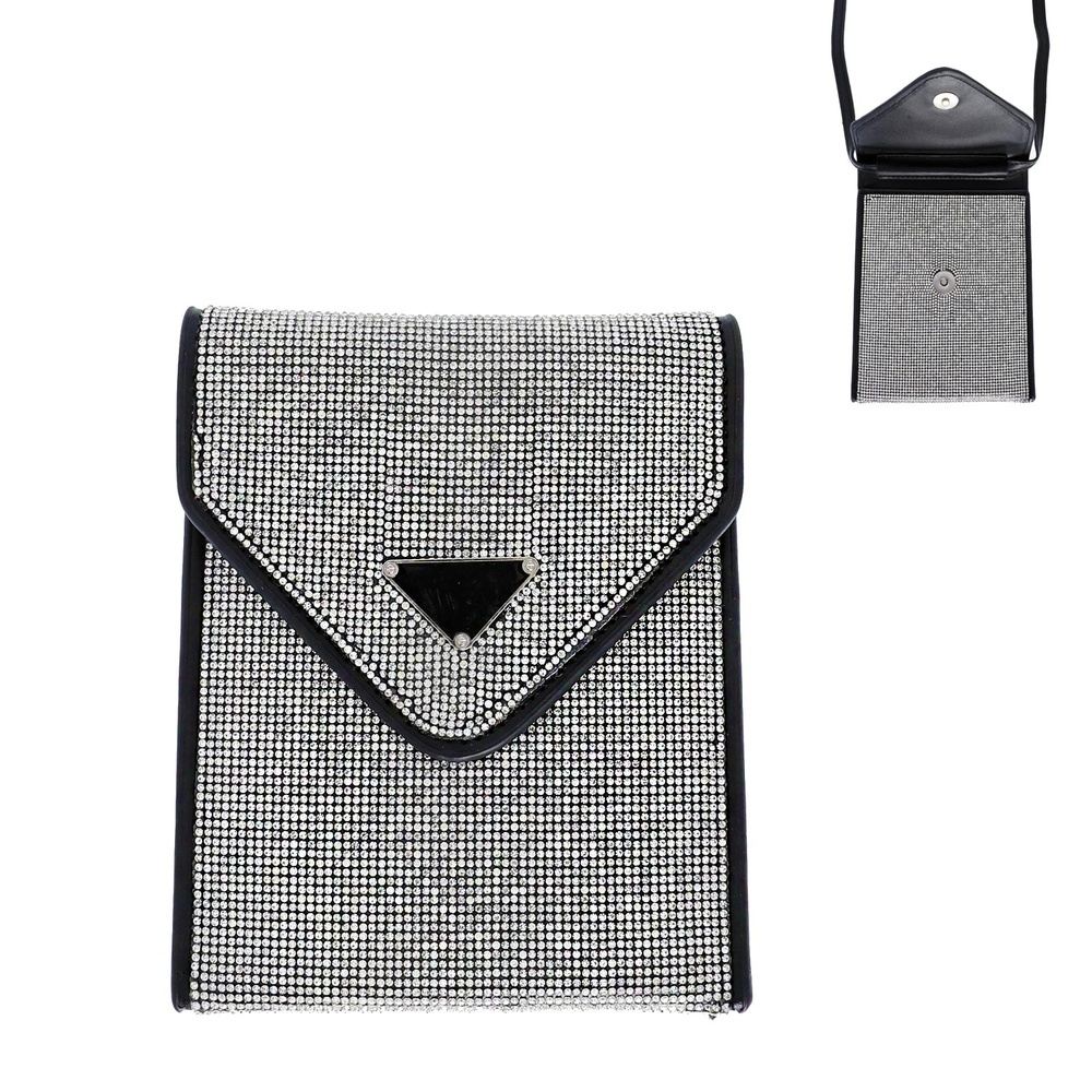 CRYSTAL RHINESTONE STUDDED MINI ENVELOPE CROSSBODY PHONE BAG WITH ADJUSTABLE REMOVABLE STRAP