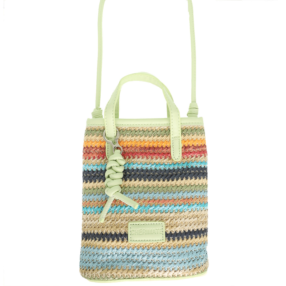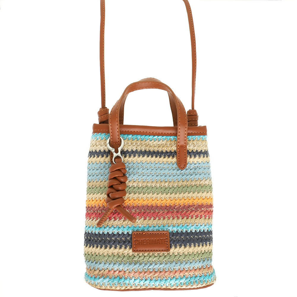 STRAW WOVEN STRIPE PATTERN CROSSBODY BAG WITH LEATHER TRIM AND CORD