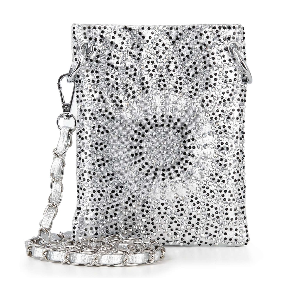 A BOLD RHINESTONE DESIGN BUT DO NOT LET THE LITTLE SIZE FOOL YOU, THIS BAG IS FULL ON FUN SINGLE CHAIN CARRYING STRAP WITH 23” INCH DROP LENGTH 1 INTERIOR SLIP POCKET FAUX LEATHER WITH LINED INTERIOR SNAP CLOSURE SILVER-TONE HARDWARE