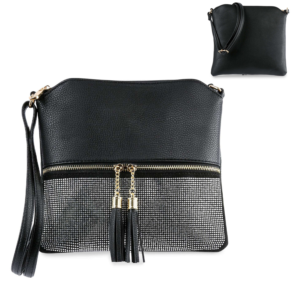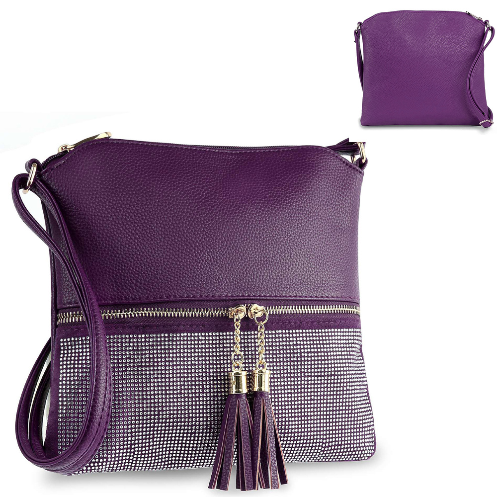 RHINESTONE ACCENTED CROSSBODY FEATURES DECORATIVE TASSEL ACCENTED ZIPPER PULLS ON THE LARGE FRONT POCKET 1 BACK ZIP POCKET 22”L ADJUSTABLE STRAP FAUX LEATHER WITH LINED INTERIOR 2 INTERIOR SLIP POCKETS & 1 ZIP POCKET TOP ZIP CLOSURE GOLD-TONE HARDWARE
