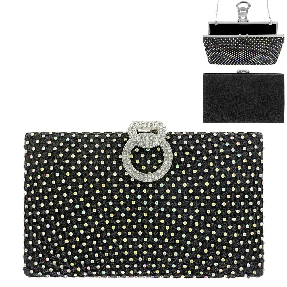 Rhinestone Embellished Evening Clutch With Circular Pave Clasp And Gold Chain