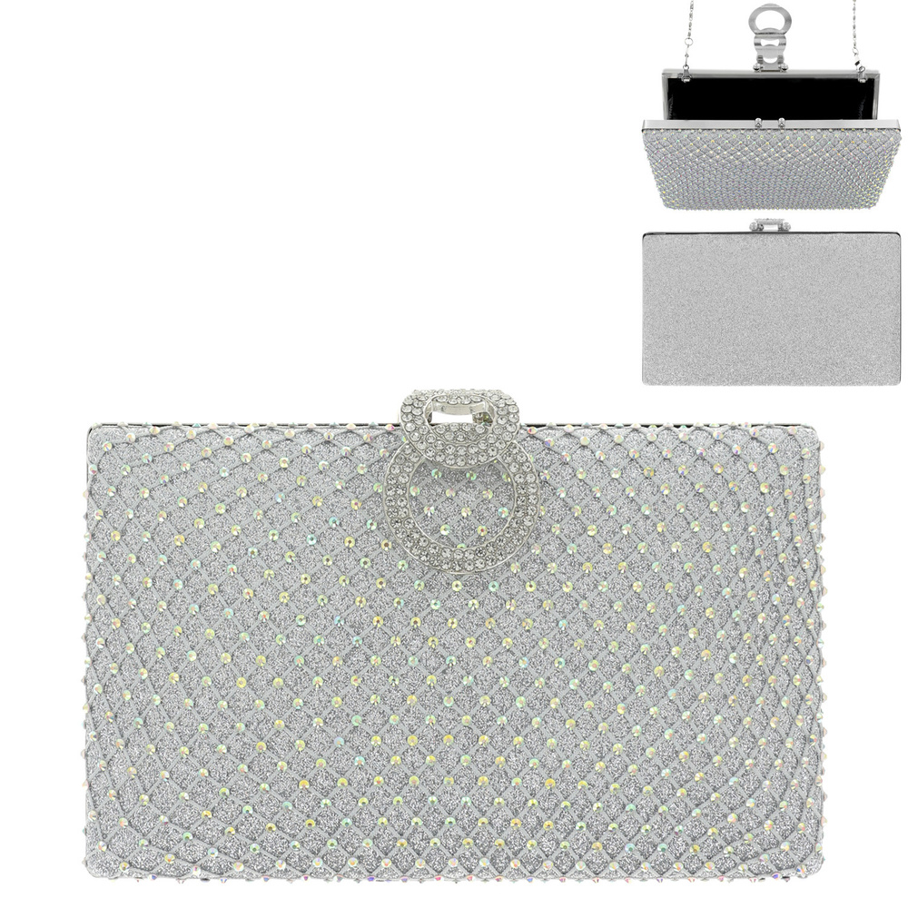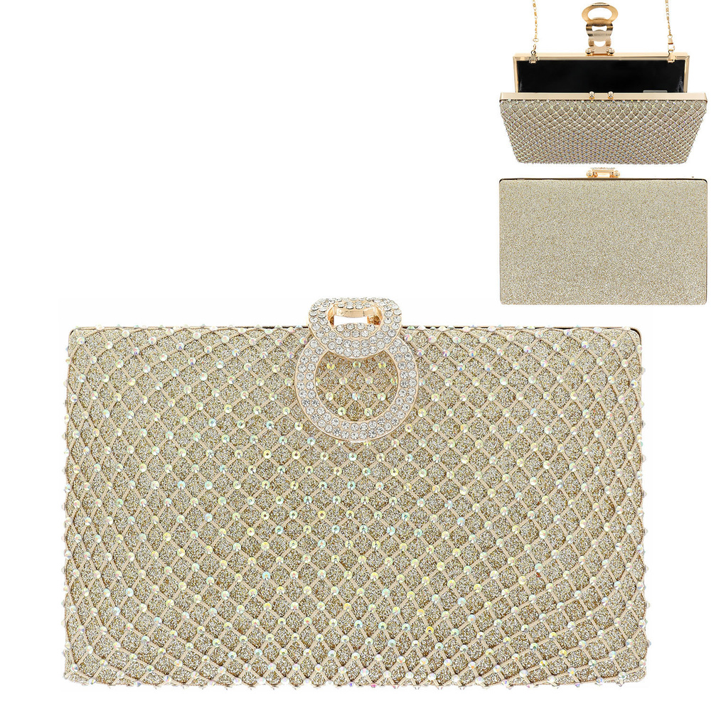 RHINESTONE EMBELLISHED EVENING CLUTCH WITH CIRCULAR PAVE CLASP AND GOLD CHAIN