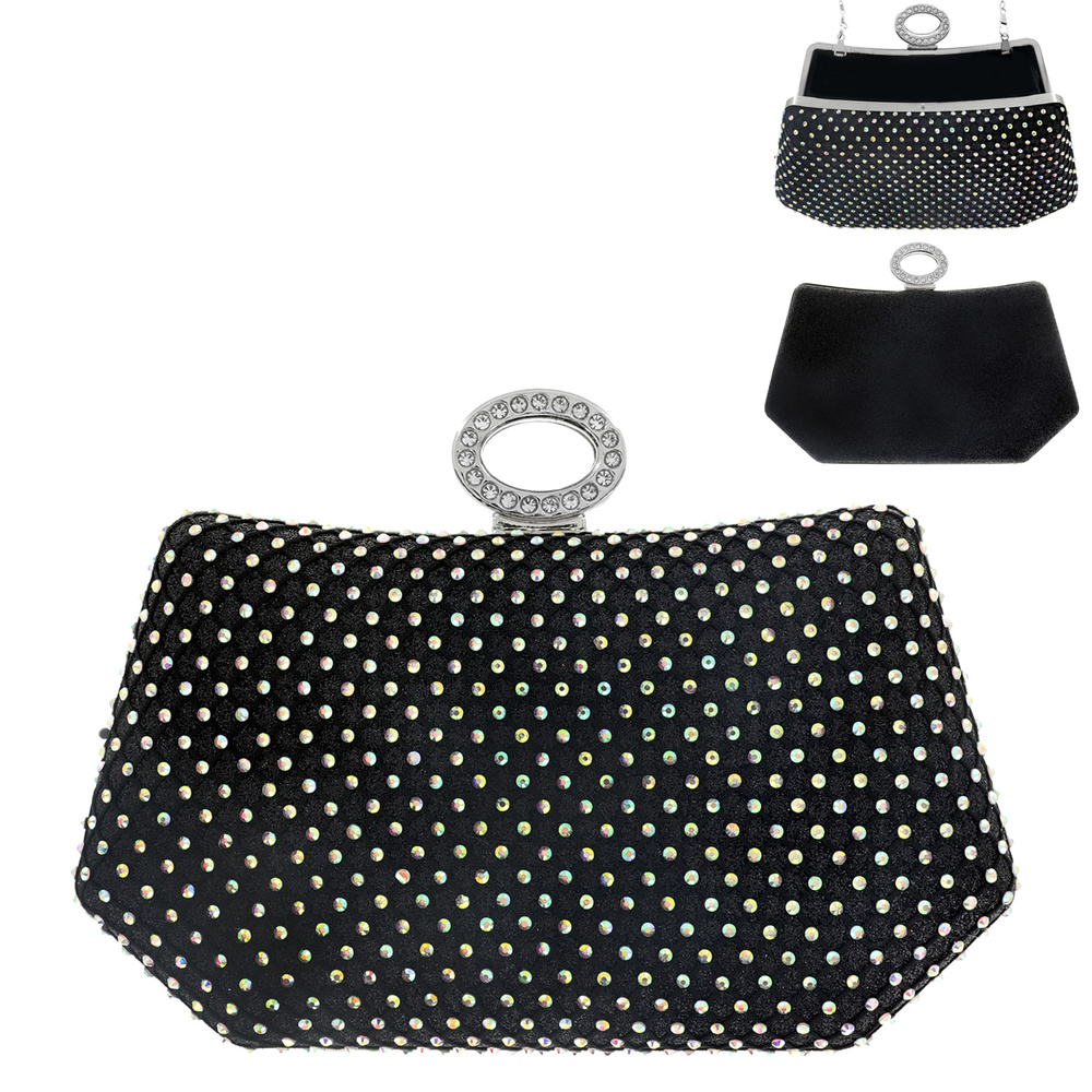 Rhinestone Embellished Evening Clutch With Circular Pave Handle And Gold Chain Strap