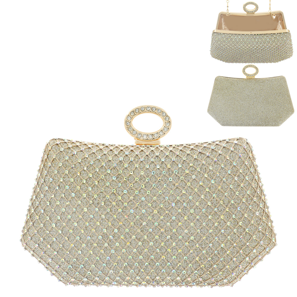 RHINESTONE EMBELLISHED EVENING CLUTCH WITH CIRCULAR PAVE HANDLE AND GOLD CHAIN STRAP