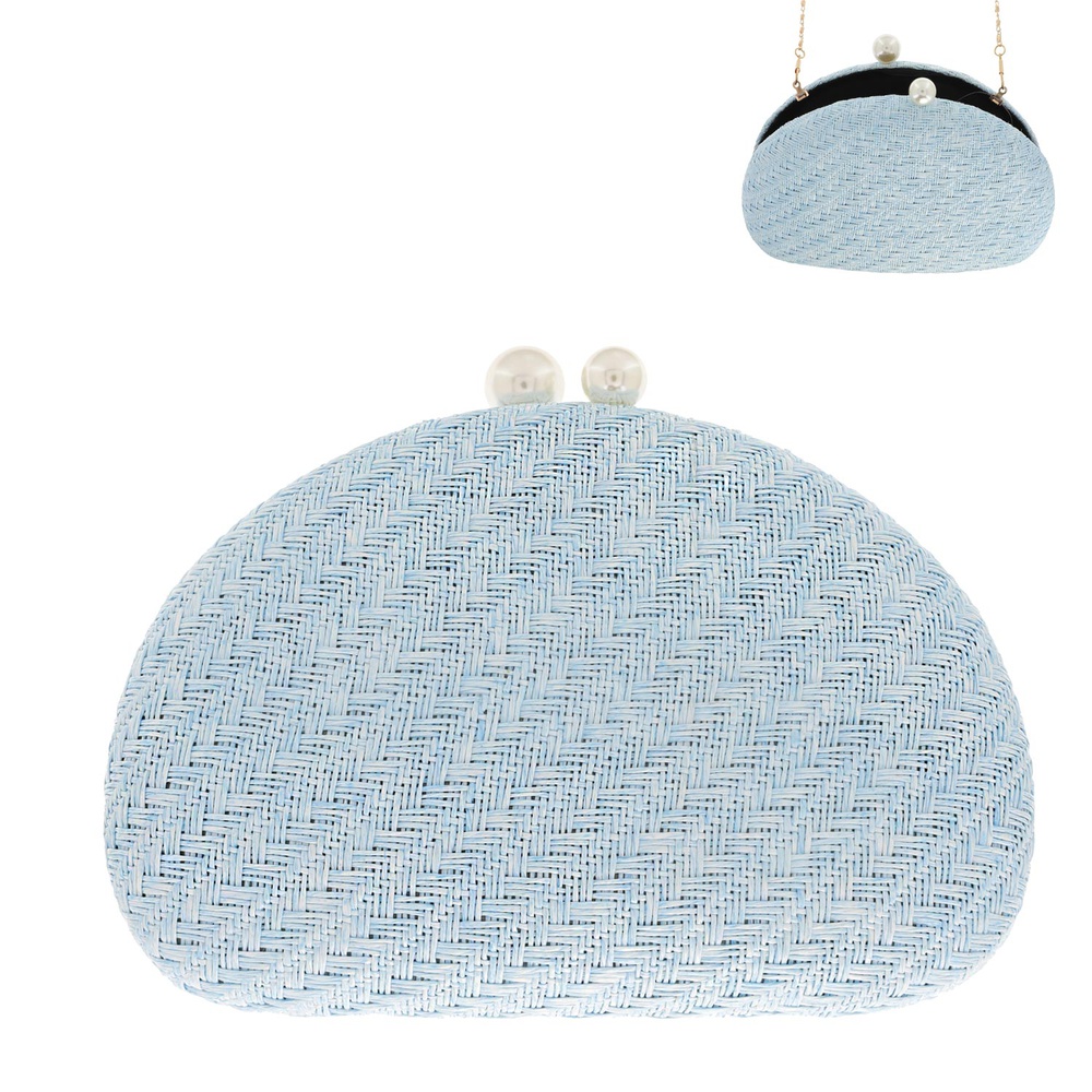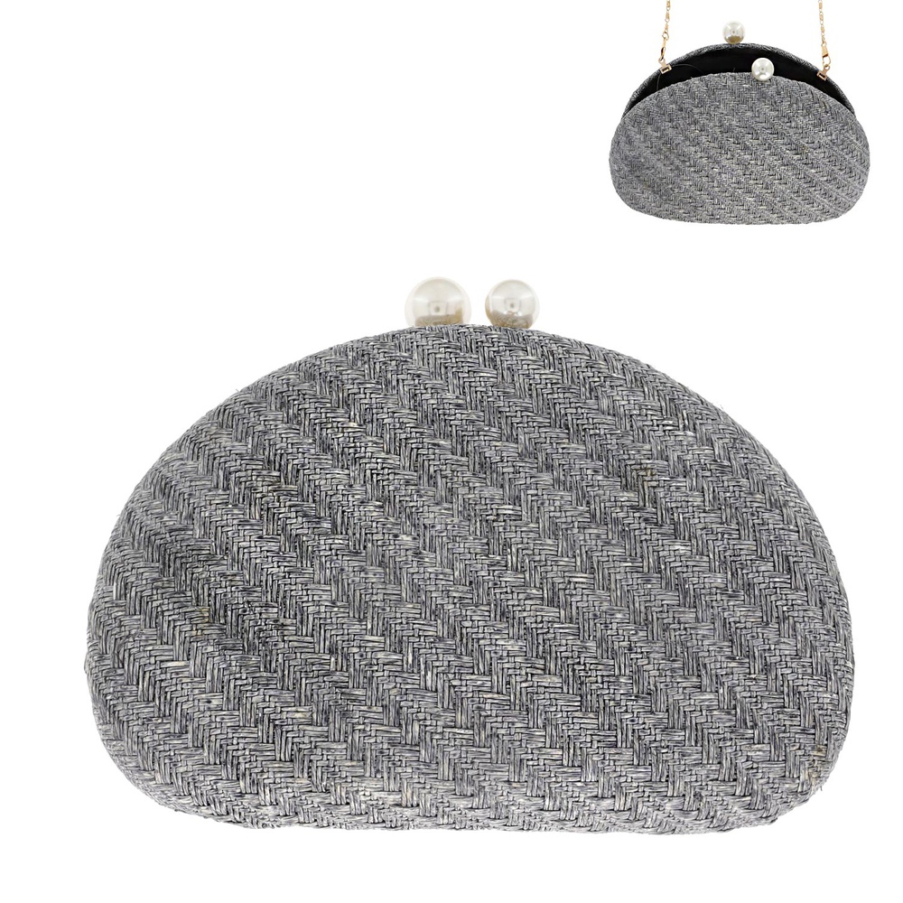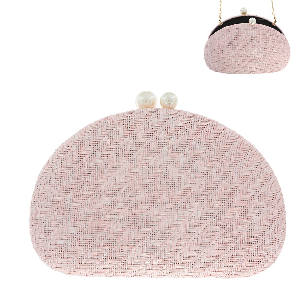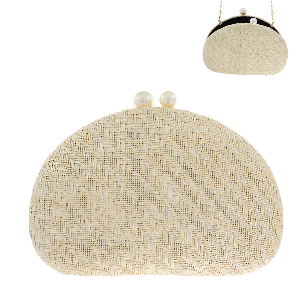 WOVEN ROUND EVENING BOX CLUTCH PURSE WITH PEARL CLOSURE AND DETACHABLE METAL CHAIN STRAP