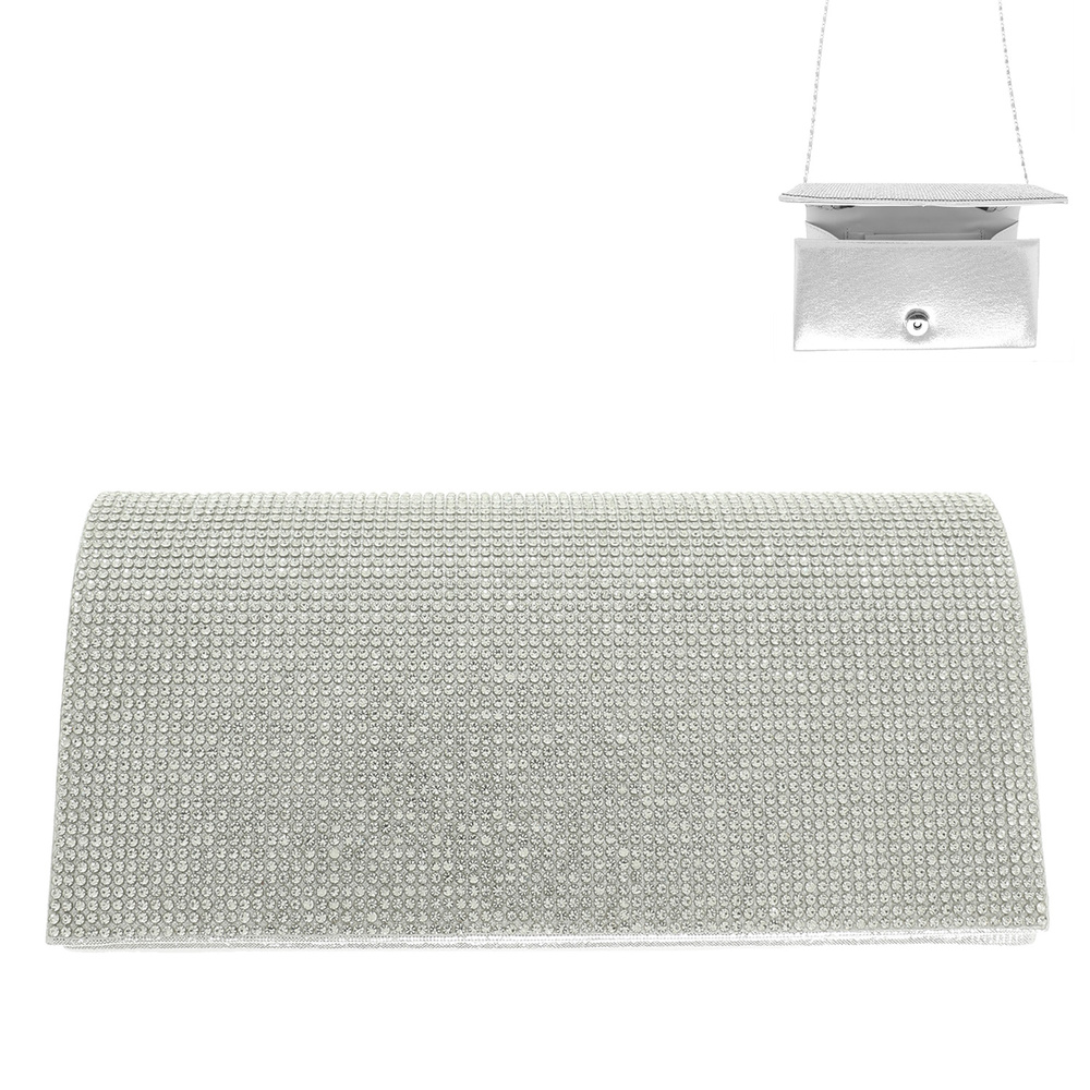 RHINESTONE EMBELLISHED ENVELOPE FLAP CLUTCH PURSE WITH DETACHABLE METAL CHAIN STRAP
