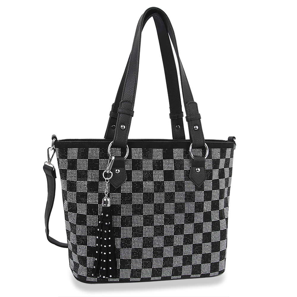 CHECKERED PATTERN CRYSTAL RHINESTONE STUDDED TOTE BAG WITH FRINGE CHARM AND DETACHABLE STRAP