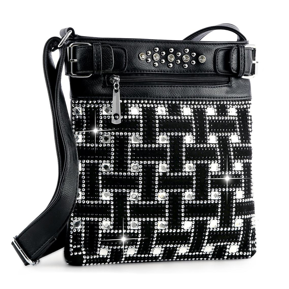 Woven Pattern Crystal Rhinestone Studded Denim Tote Bag With Front Zipper Compartment