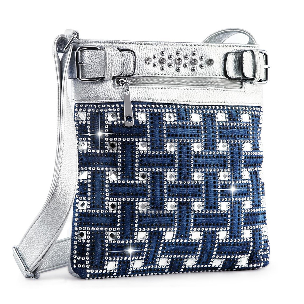WOVEN PATTERN CRYSTAL RHINESTONE STUDDED DENIM TOTE BAG WITH FRONT ZIPPER COMPARTMENT