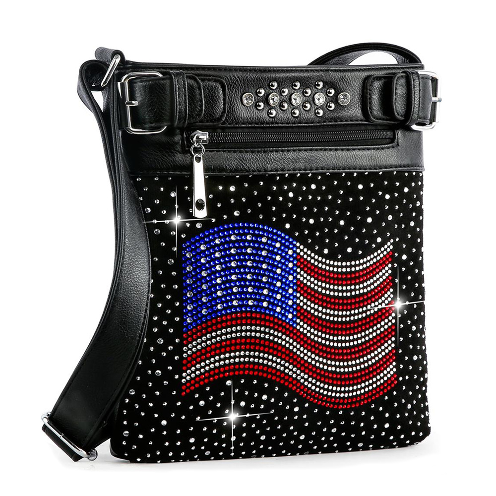 AMERICAN FLAG CRYSTAL RHINESTONE STUDDED TOTE BAG WITH FRONT ZIPPER COMPARTMENT AND ADJUSTABLE STRAP