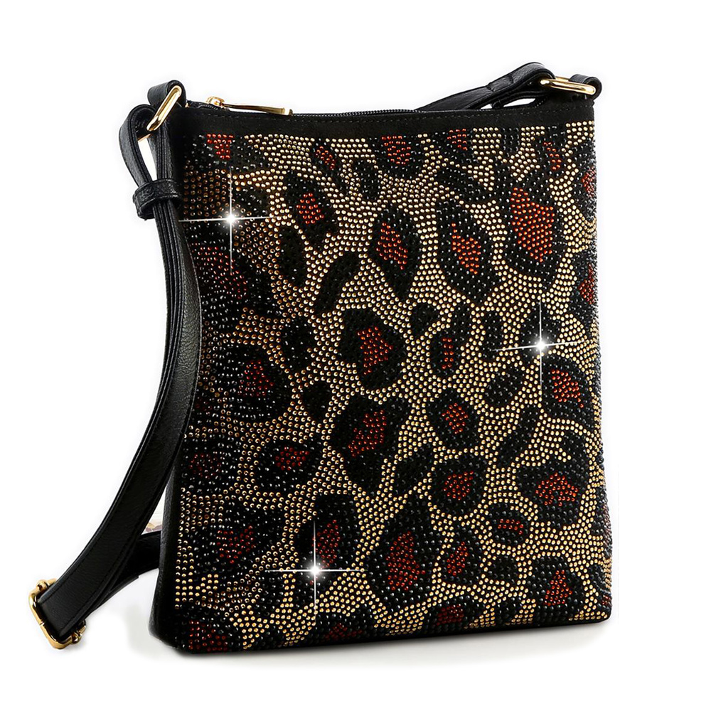 LEOPARD PRINT DESIGN CRYSTAL RHINESTONE STUDDED TOTE BAG WITH ADJUSTABLE STRAP
