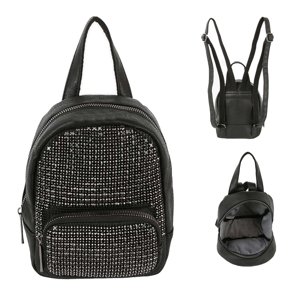 PUNK STYLE AB RHINESTONE STUDDED TOP ZIPPER CLOSURE MINI FAUX LEATHER BACKPACK WITH EXTERIOR ZIPPER POCKET