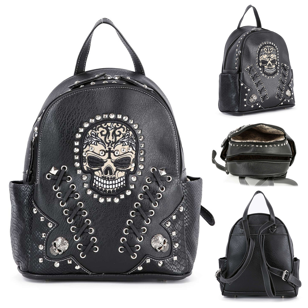 MULTI-POCKET BACKPACK SNAKESKIN EMBOSSED ACCENTS RHINESTONE SKULLS REALLY MAKE IT POP TOP ZIP CLOSURE FAUX LEATHER WITH LINED INTERIOR INSIDE ZIPPERED POCKET AND CELL PHONE POUCH ADJUSTABLE BACKPACK STRAPS DUAL SIDE POCKETS SILVER-TONE HARDWARE