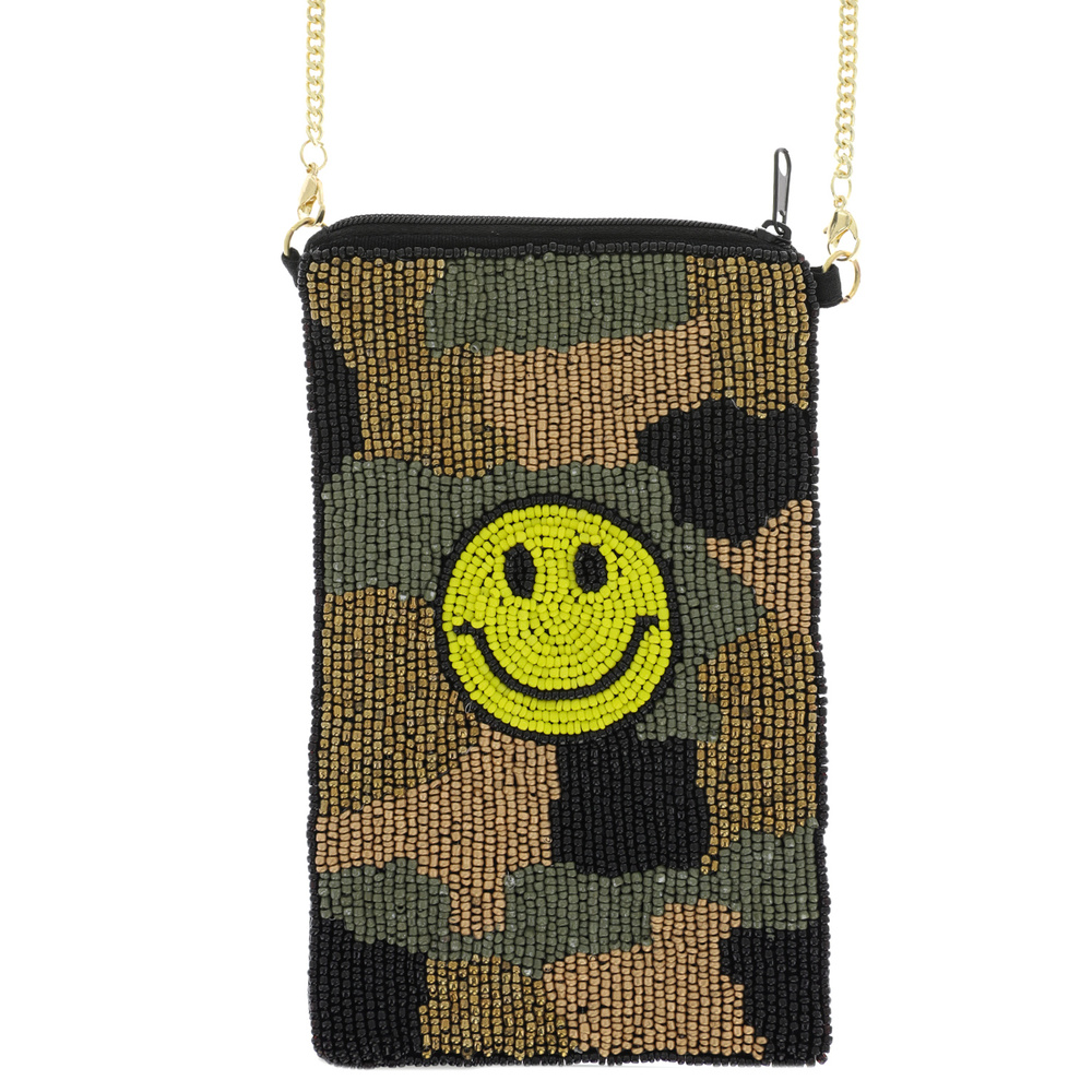90S GRUNGE STYLE, SMILEY FACE MILITARY CAMO PRINT BEADED COIN MESSENGER BAG WITH STRAP