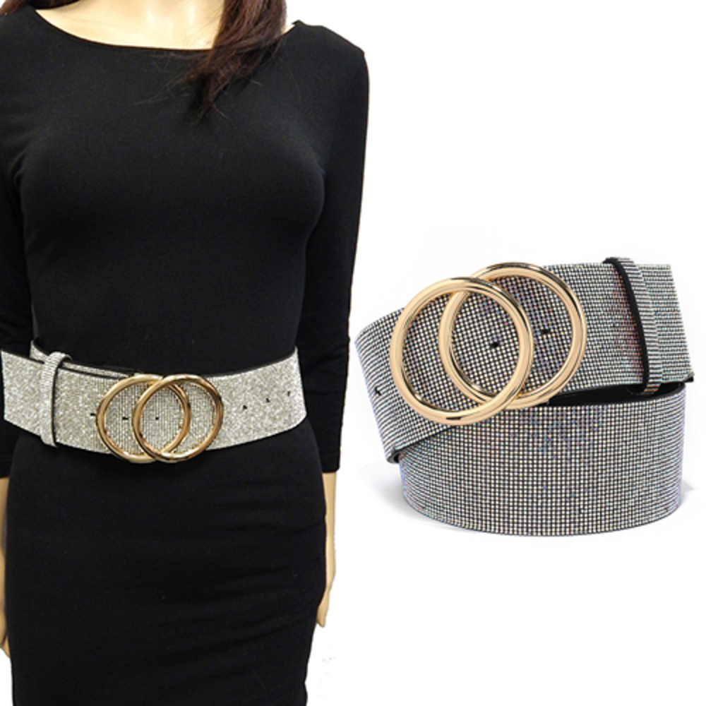 Double O-ring Crystal Rhinestone Circle Buckle Waist Belt In With Gold Tone Metal Accents