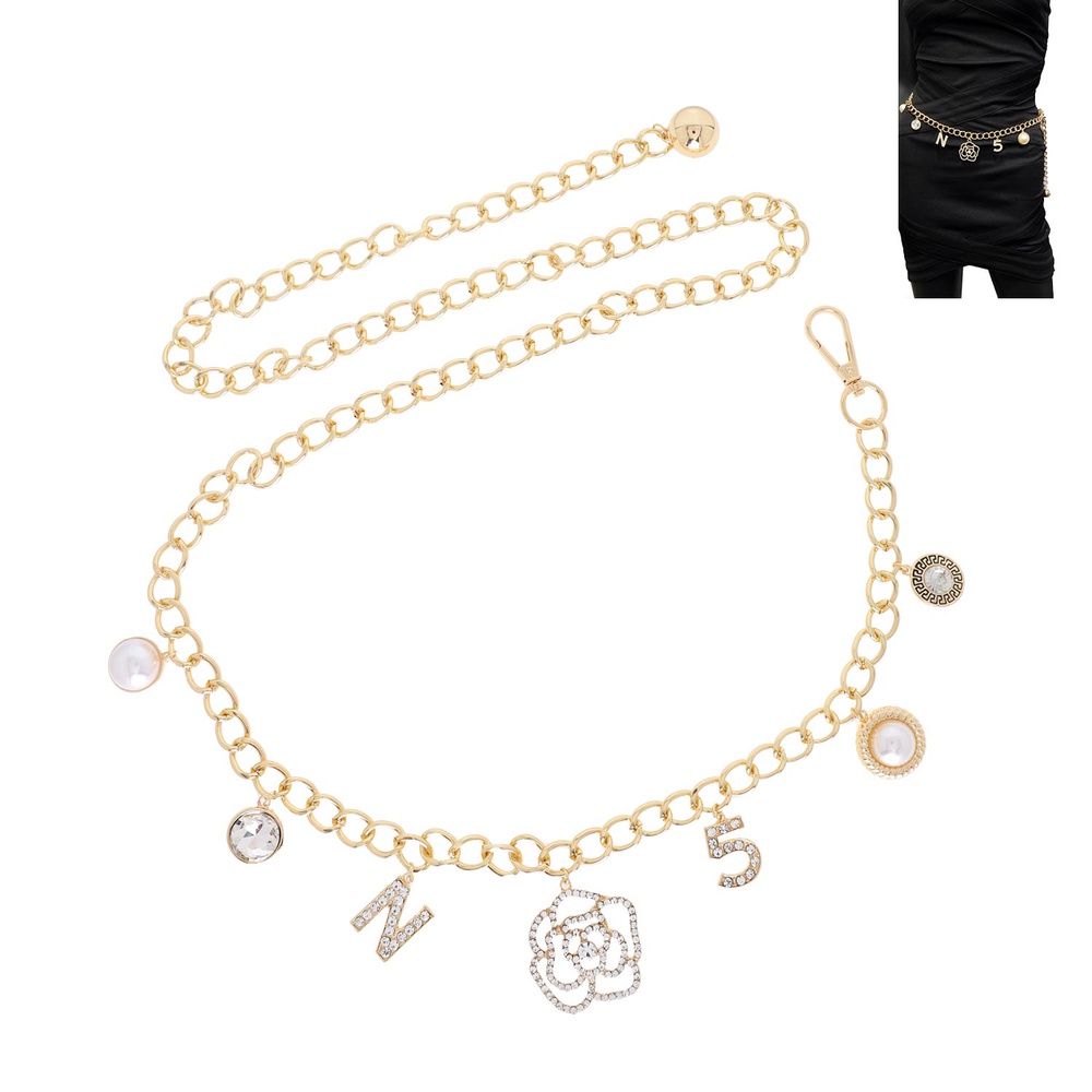 FASHIONISTA FLORAL GREEK KEY SQUARE ONE SIZE CRYSTAL RHINESTONE ENAMEL COATED CHAIN LINK MULTI CHARM WAIST BELT WITH CLASP CLOSURE