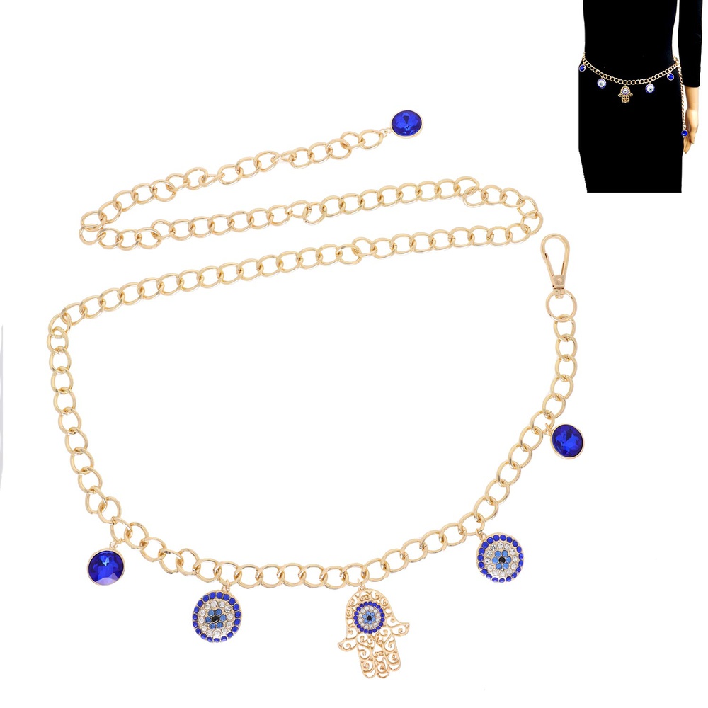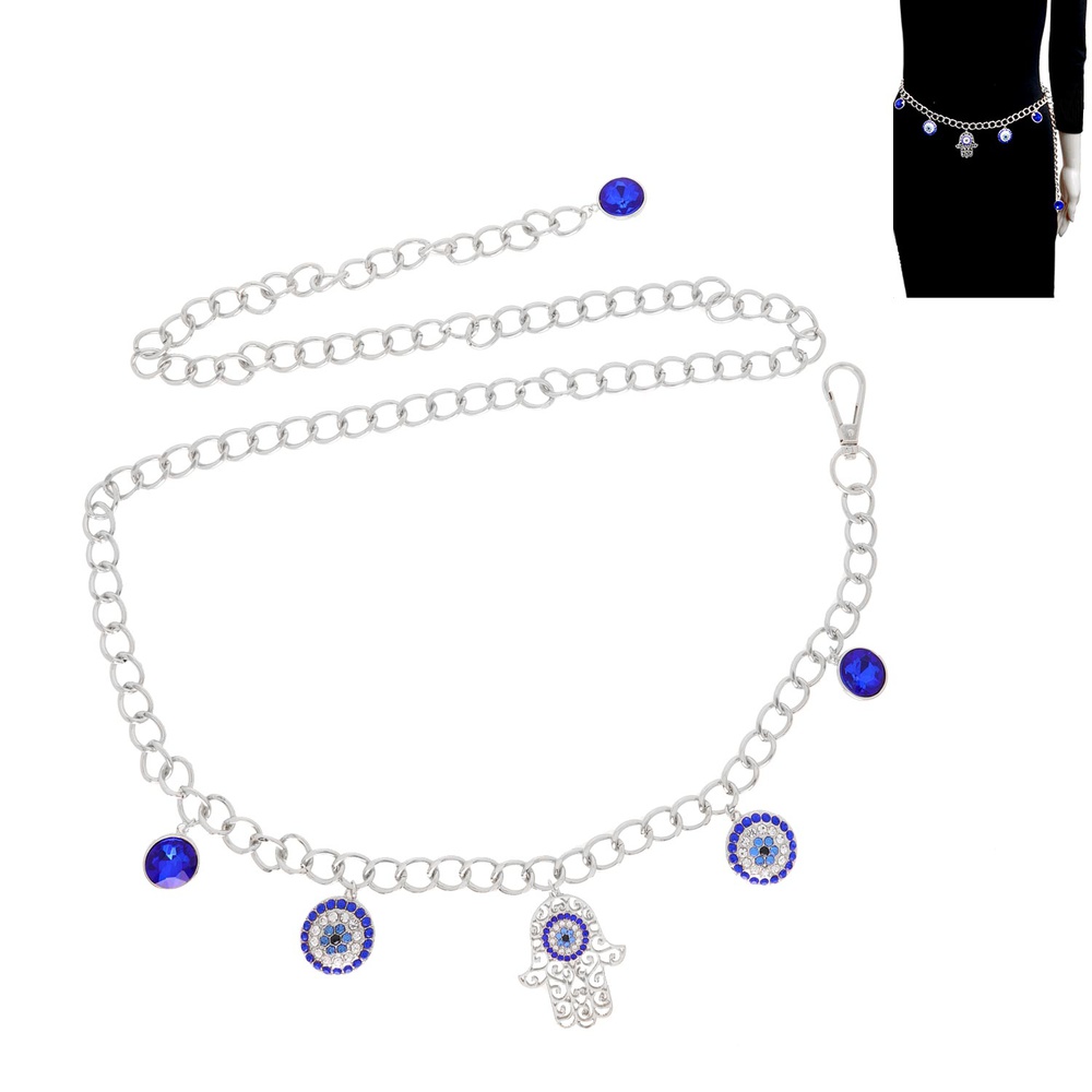 FASHIONISTA EVIL EYE ONE SIZE CRYSTAL RHINESTONE CHAIN LINK MULTI CHARM WAIST BELT WITH CLASP CLOSURE