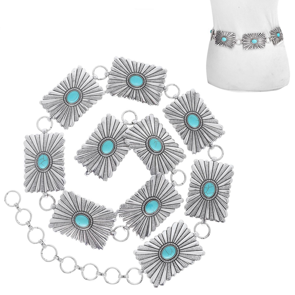 WESTERN TURQUOISE SEMI STONE RECTANGLE CONCHO CHAIN LINK BELT IN SILVER TONE METAL