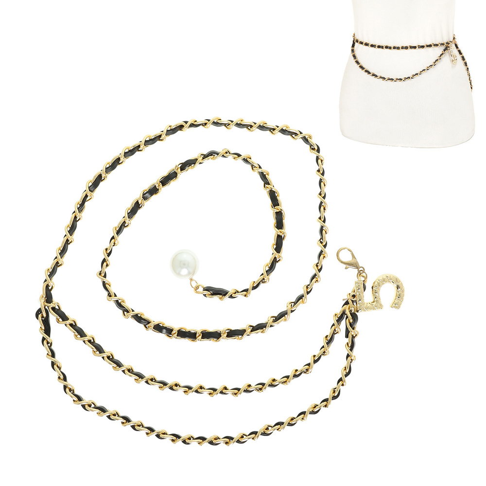 NUMBER 5 CHARM PEARL EMBELLISHED LEATHER WOVEN LINK CHAIN BELT