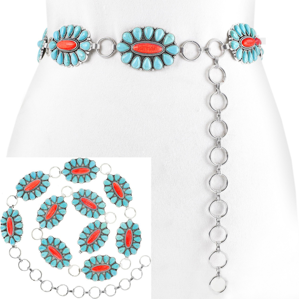Western Turquoise Stone Squash Blossom Chain Link Belt