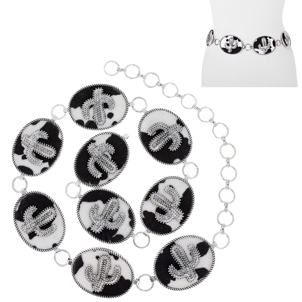 Western Cow Print Metal Cactus Adjustable Oval Concho Chain Belt