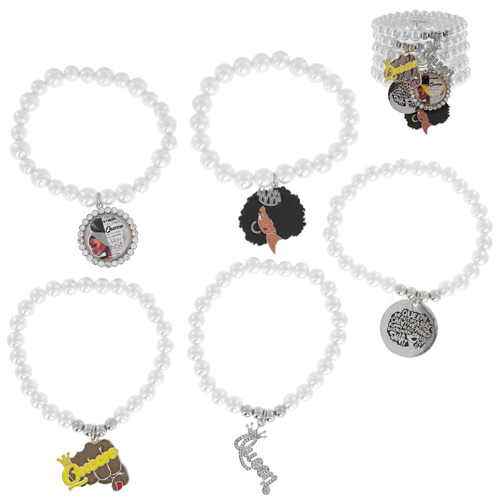 5-piece Black Queen Royal Crown Stackable Layering Stretch Multi Charm Beaded Bracelet Set