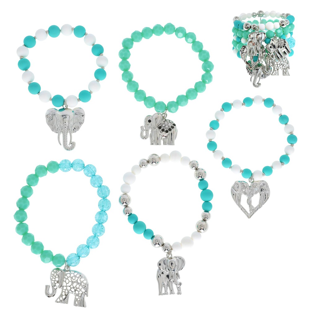 5-PACK GOOD LUCK ELEPHANT CRYSTAL RHINESTONE BEADED CHARM STRETCH STACKABLE BRACELET SET