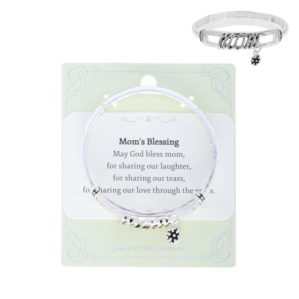 MOTHER'S DAY MOMS BLESSING FLORAL CHARM STRETCH BRACELET IN SILVER TONE METAL