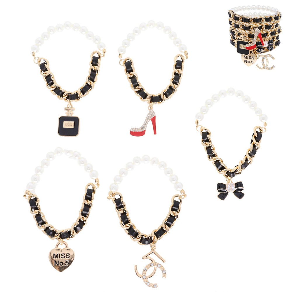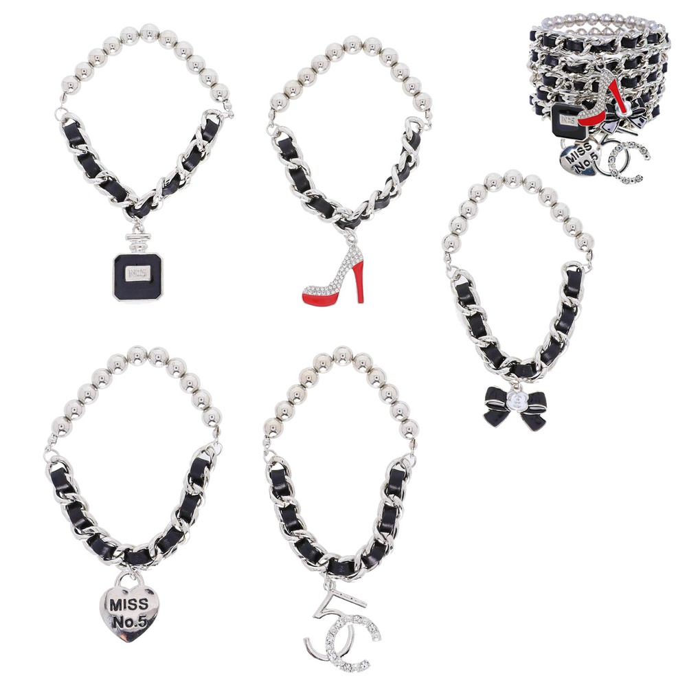 5-PACK FASHIONISTA NUMBER FIVE RED BOTTOMS STILETTOS LEATHER WOVEN ENAMEL COATED MULTI CHARM ADJUSTABLE CHAIN LINK BRACELET SET