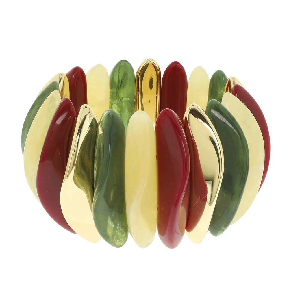 MULTICOLOR RESIN STRETCH BRACELET WITH MARBLED AND GOLD TONE METAL PANELS