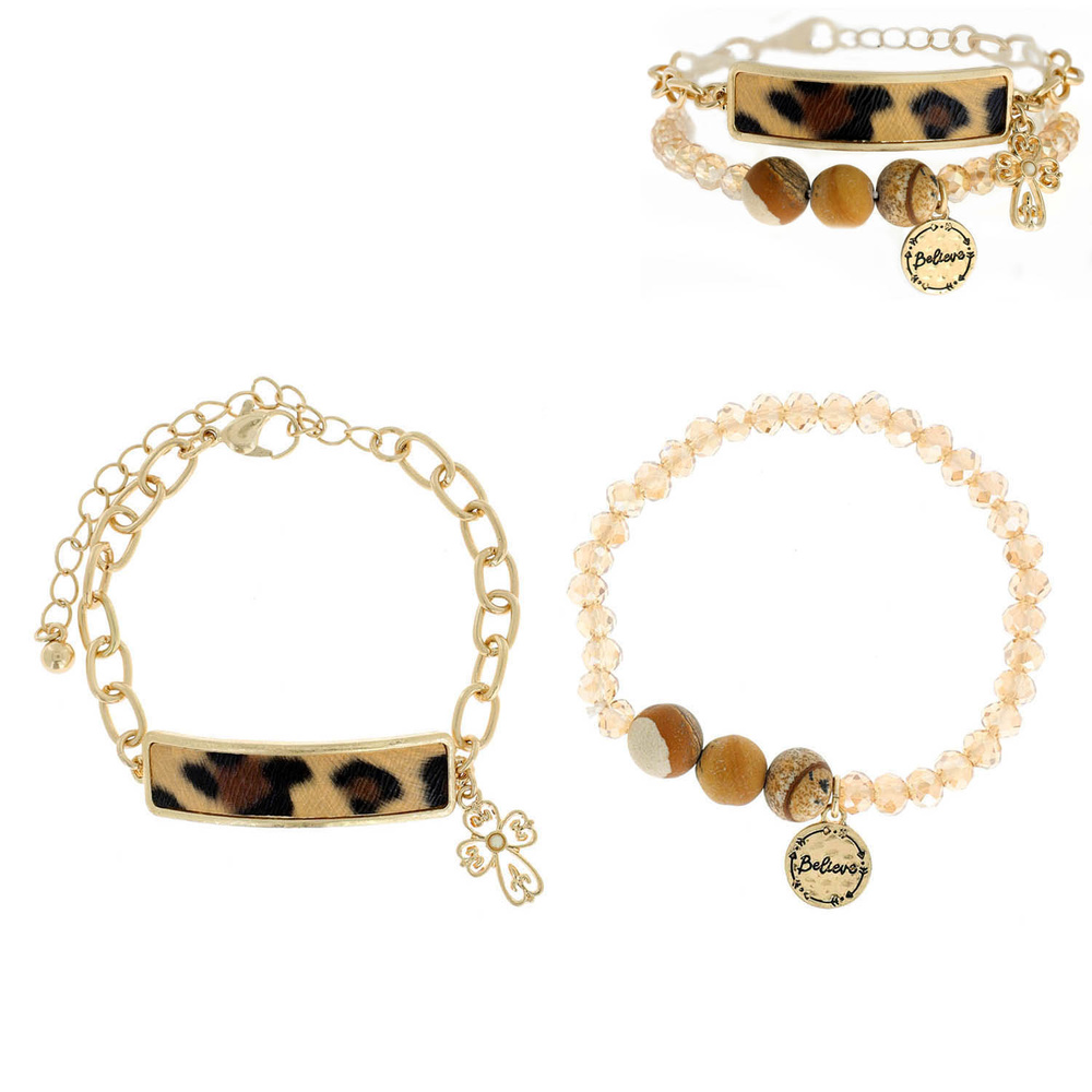 RELIGIOUS BELIIEVE / CROSS CHARM LEOPARD CHEETAH PRINT BAR CHAIN AND BEAD STRETCH BRACELET SET