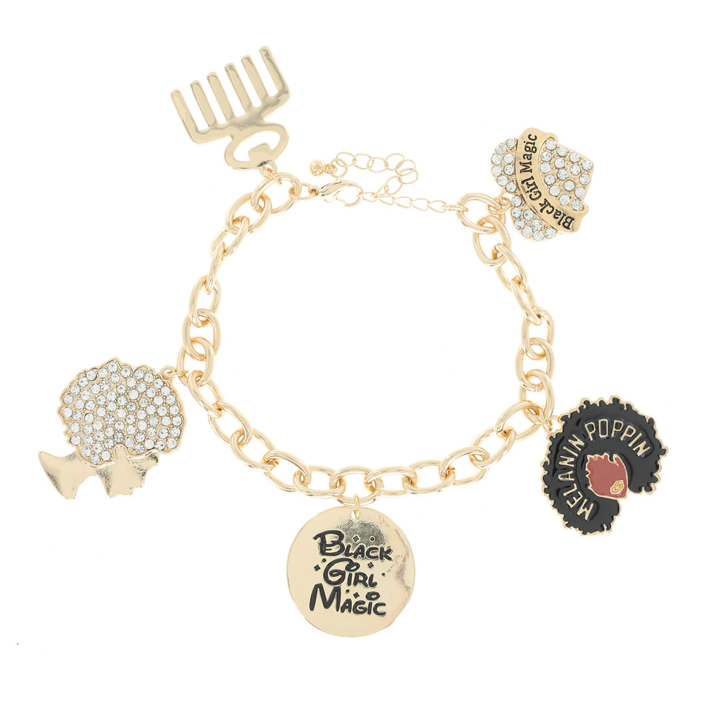 CRYSTAL RHINESTONE AFRICAN AMERICAN BLACK GIRL MAGIC HEART COMB MULTI CHARM BRACELET