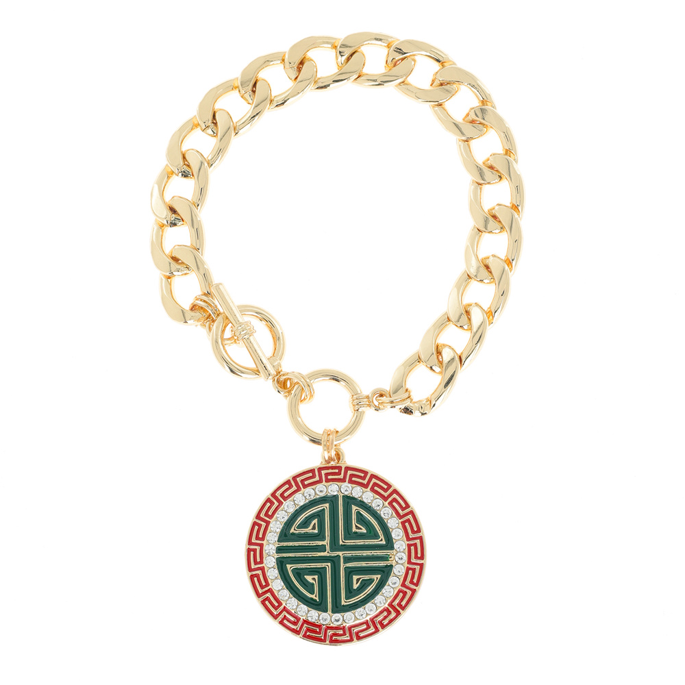 Rhinestone Pave Greek Key Square Enamel Coin Charm Cuban Link Toggle Bracelet