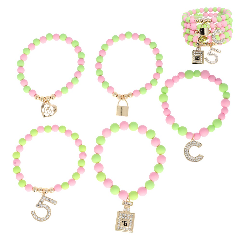 5-PACK FASHIONISTA NUMBER FIVE BEADED ENAMEL COATED CHARM STRETCH STACKABLE BRACELET SET