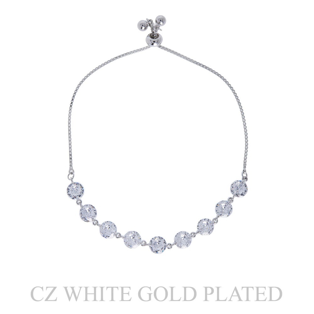 BRIDAL CUBIC ZIRCONIA CIRCLE GEMSTONE LINK ADJUSTABLE SLIDER PULL-CORD BOX CHAIN BRACELET IN WHITE GOLD PLATTING