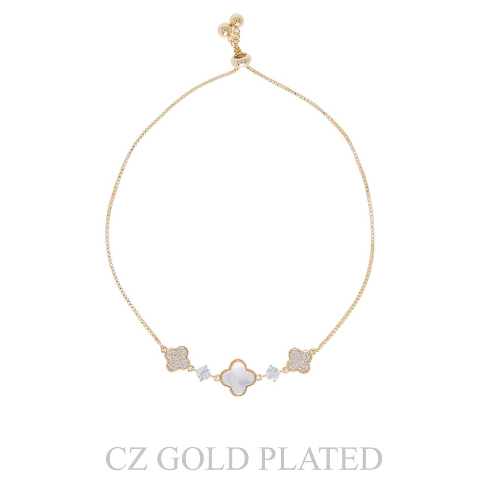 BRIDAL CUBIC ZIRCONIA MOTHER OF PEARL TRIPLE QUATREFOIL ADJUSTABLE SLIDER PULL-CORD BOX CHAIN BRACELET IN YELLOW GOLD PLATTING