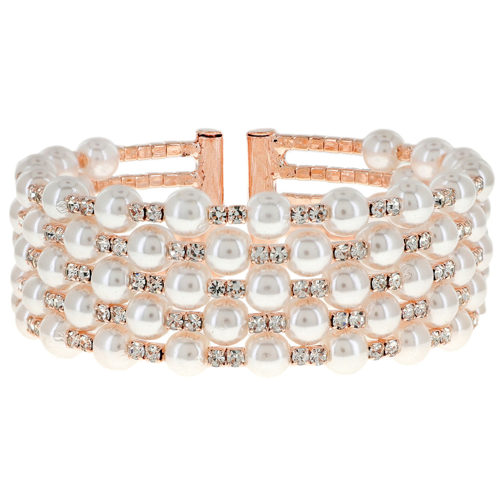 Bridal Crystal Rhinestone And Pearl Multilayer 5 Row Stacked Cuff Bracelet