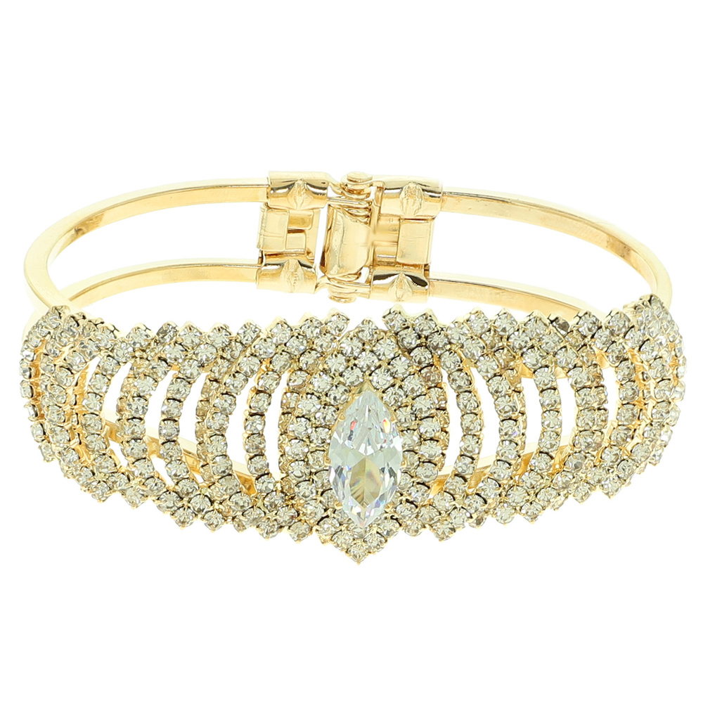 RHINESTONE CRYSTAL EMBELLISHED HINGED BANGLE BRACELET IN GOLD-TONE METAL