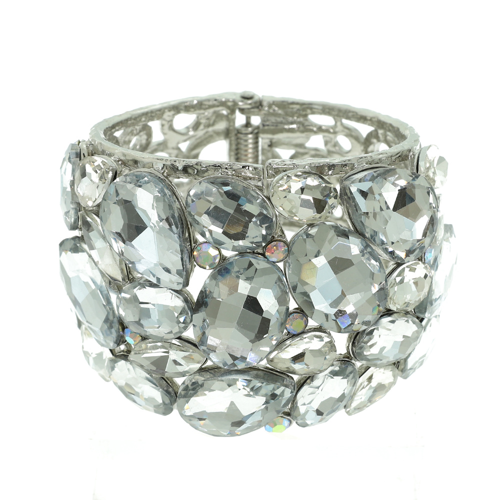 HAMMERED CRYSTAL CLUSTER HINGED BANGLE BRACELET IN SILVER-TONE METAL