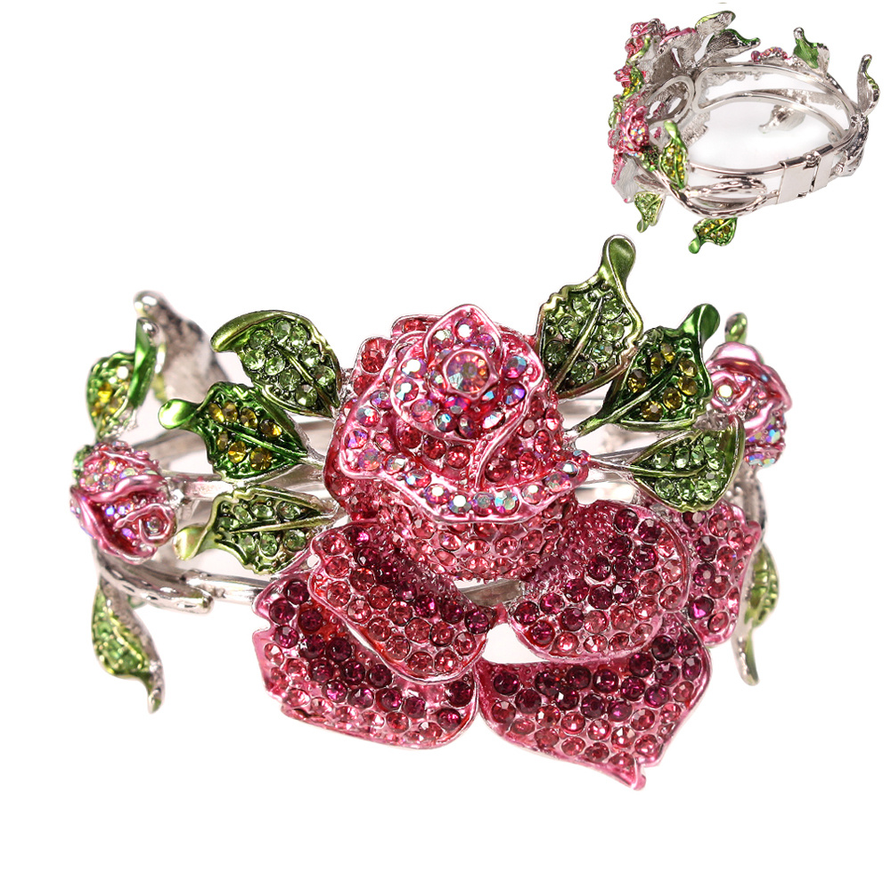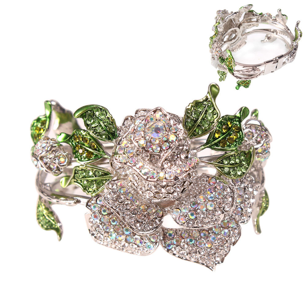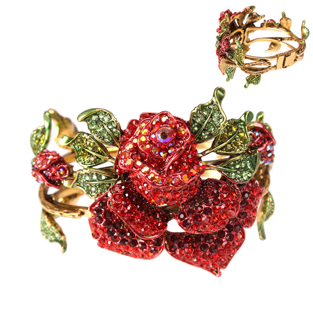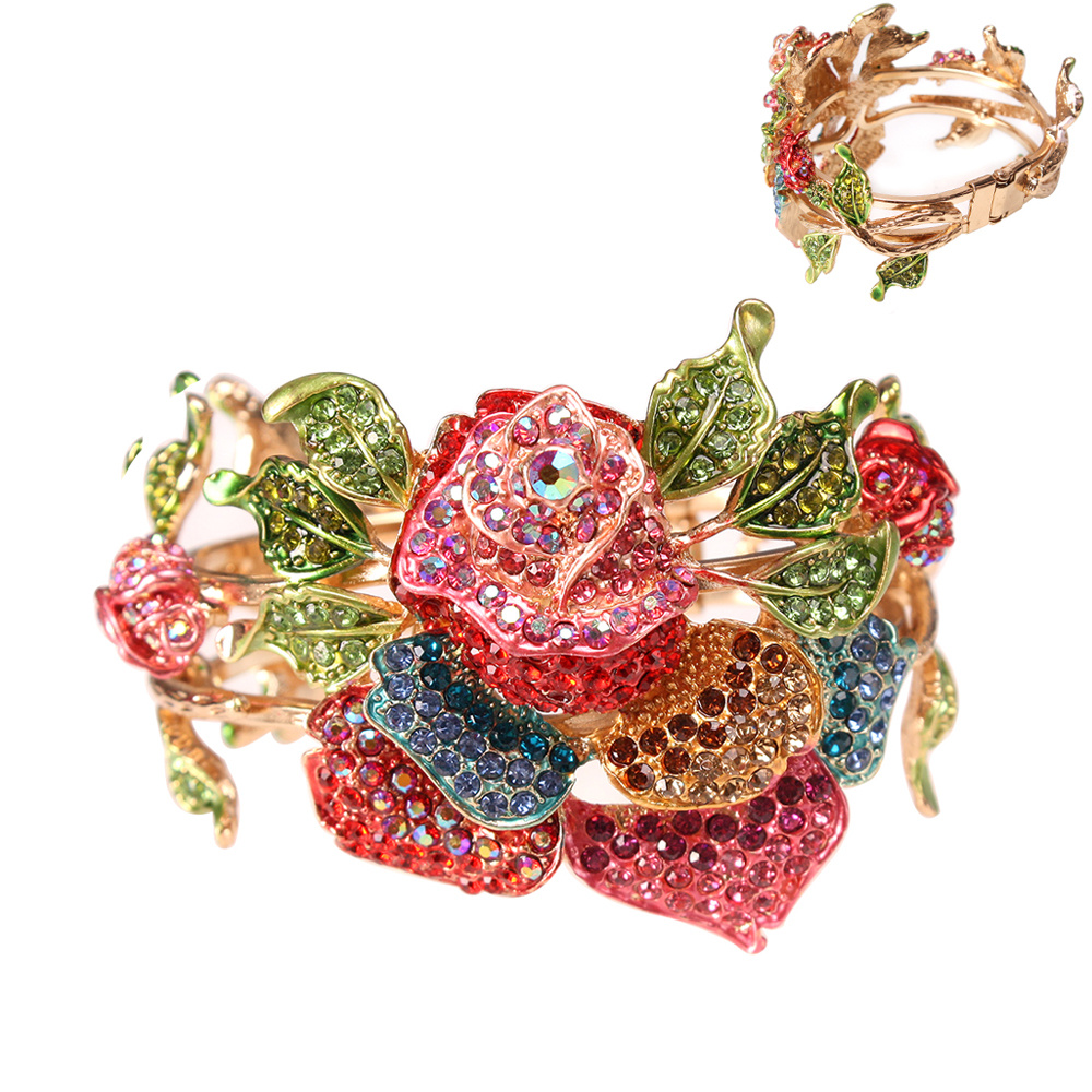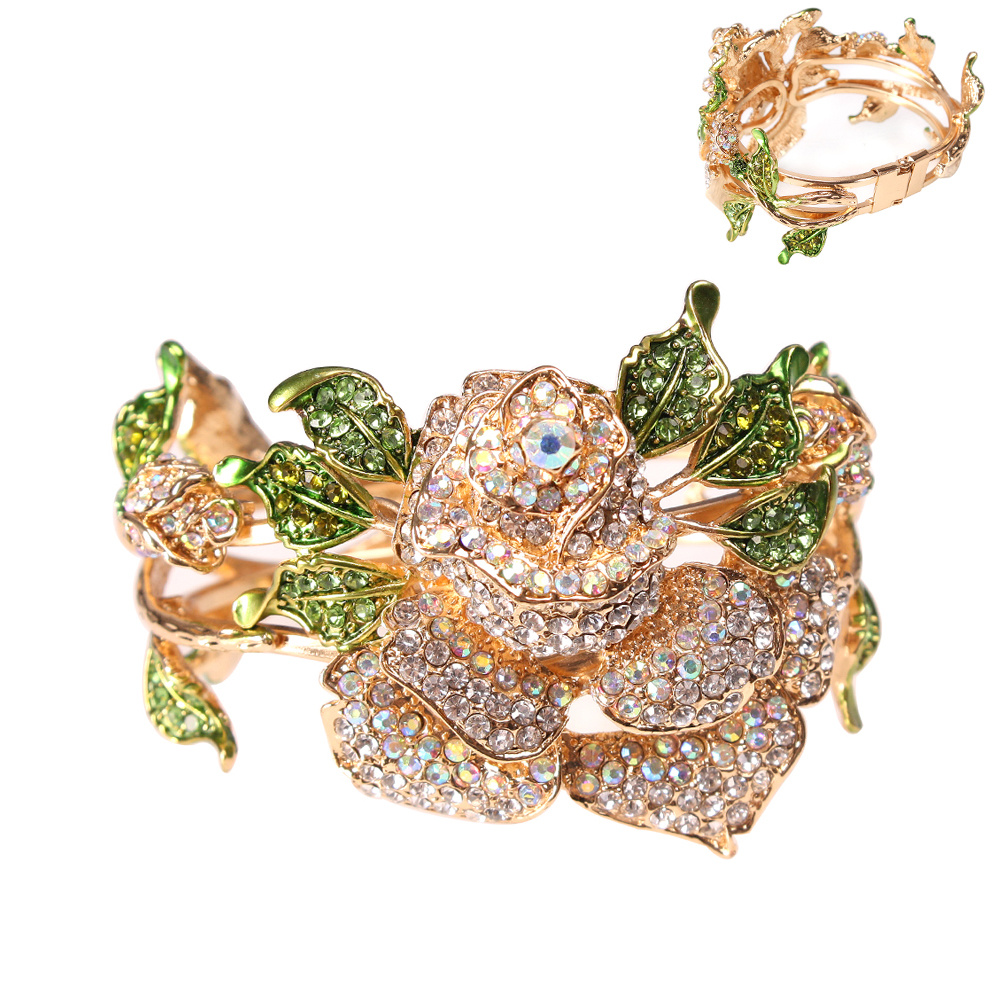 RHINESTONE PAVE ROSE HINGE BRACELET IN GOLD TONE METAL