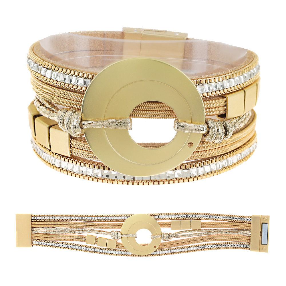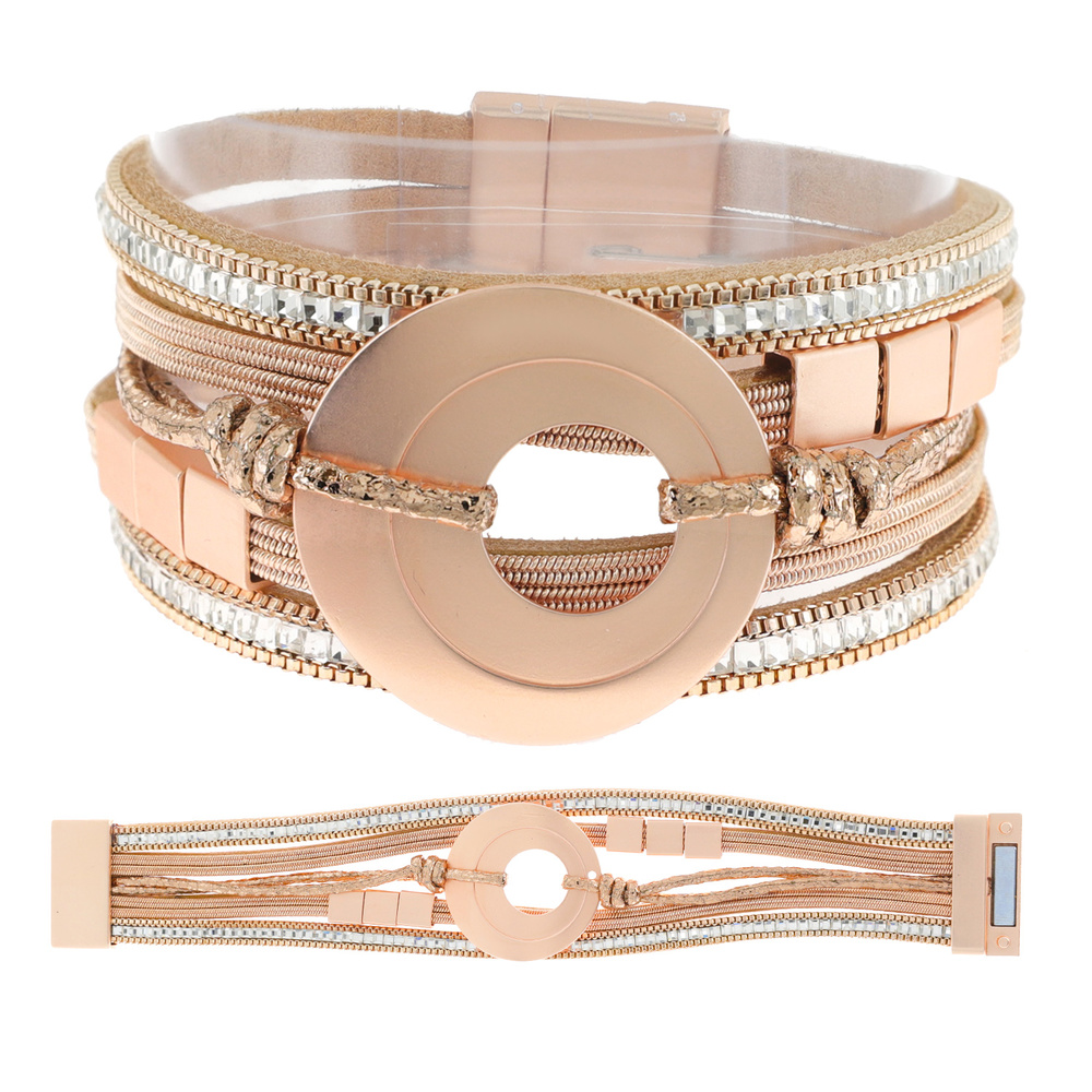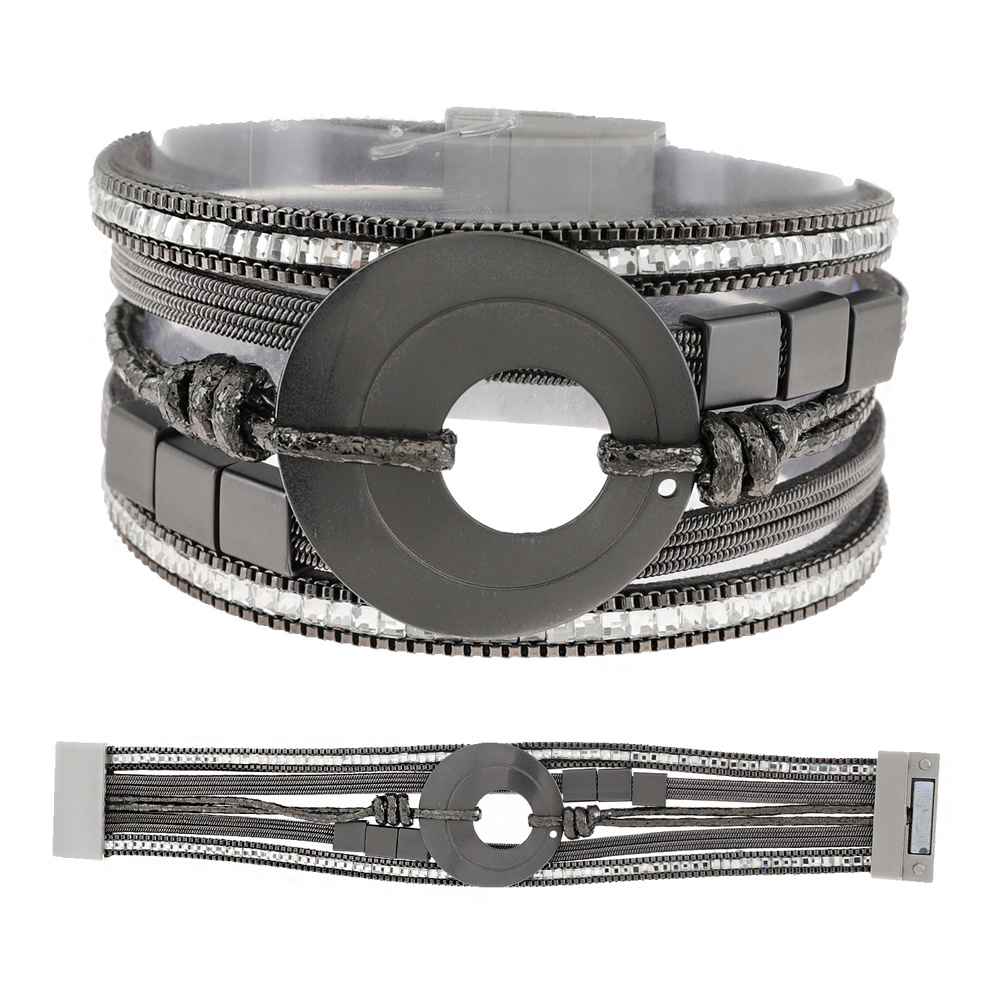 BOHEMIAN OPEN CIRCLE FAUX LEATHER MULTI-STRAND CORD CRYSTAL RHINESTONE BRACELET WITH MAGNETIC CLOSURE