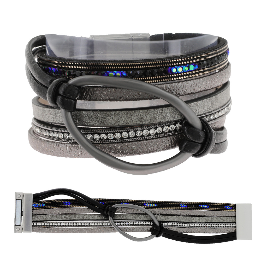 BOHEMIAN FAUX LEATHER MULTI-STRAND CRYSTAL RHINESTONE CORD LOOP BRACELET WITH MAGNETIC CLOSURE