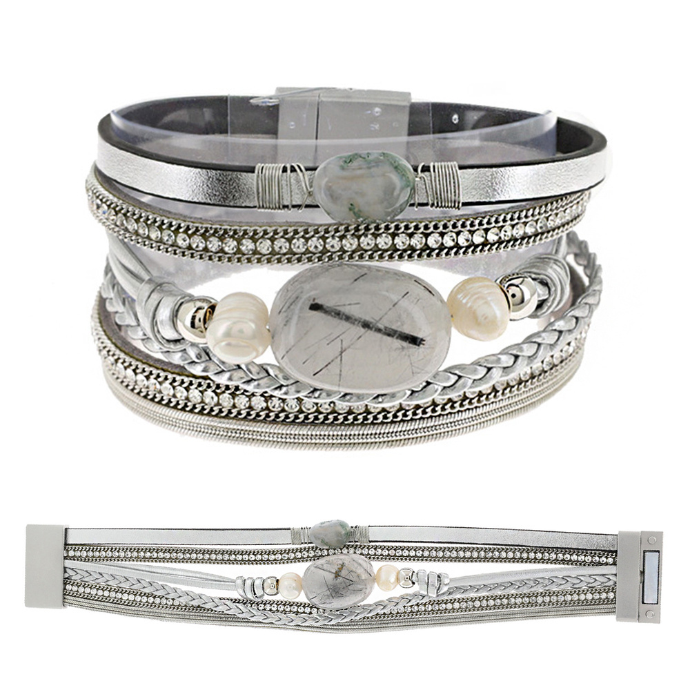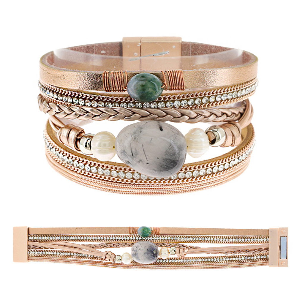 Bohemian Stone Beaded Faux Leather Multi-strand Cord Crystal Rhinestone Bracelet With Magnetic Closure