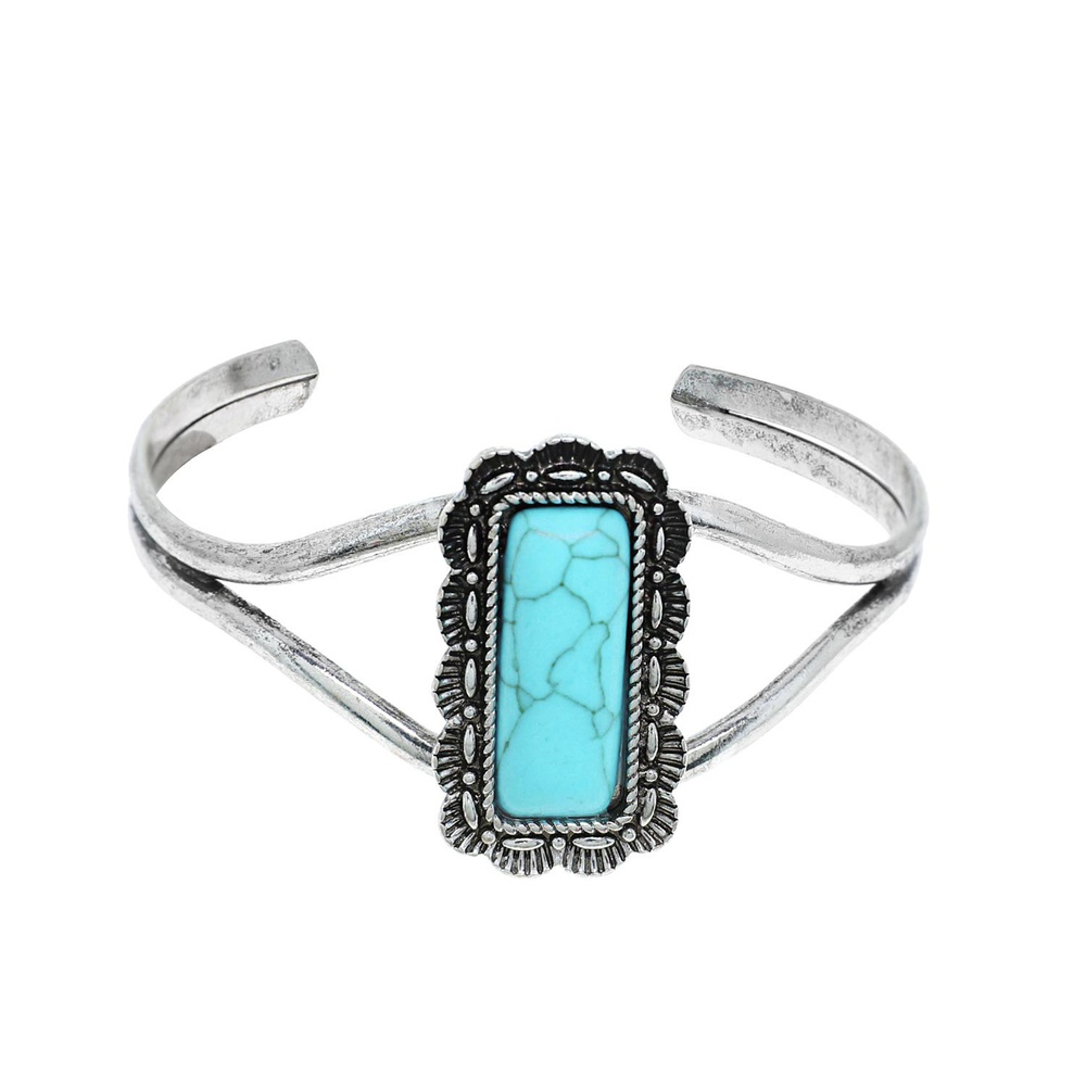 VINTAGE WESTERN TURQUOISE SEMI STONE RECTANGULAR CONCHO CUFF BRACELET IN OXIDIZED SILVER TONE METAL