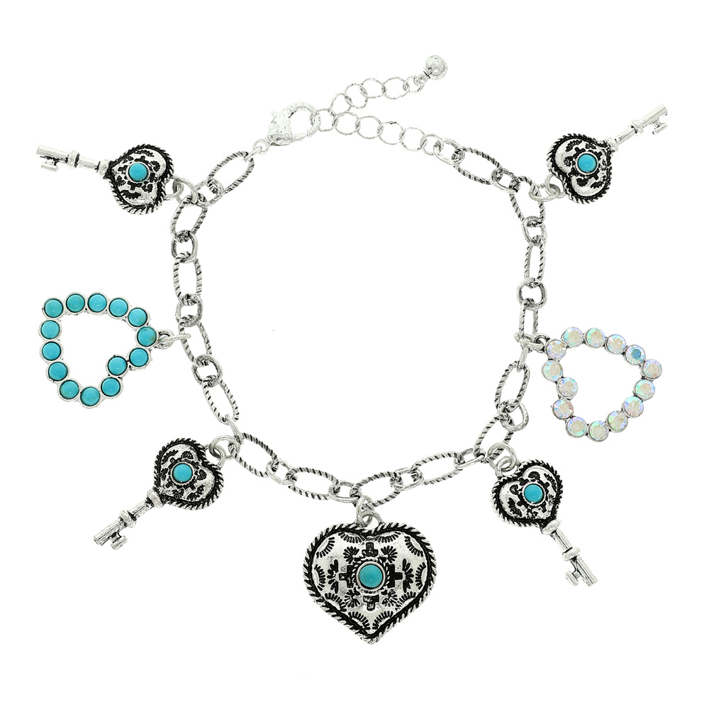 WESTERN THEME TURQUOISE CRYSTAL EMBELLISHED HEART AND KEY CHARM BRACELET